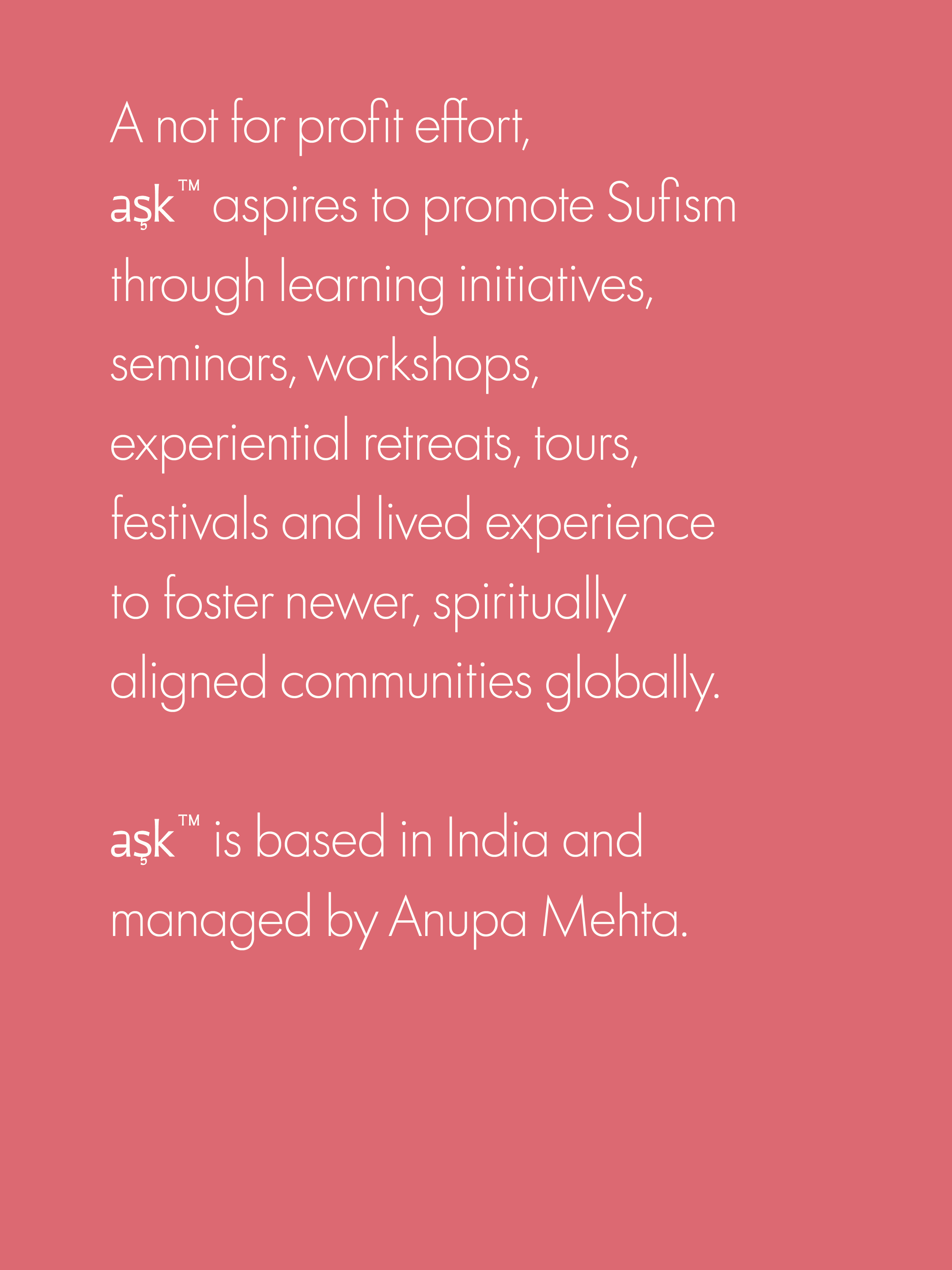 aşk™, a not for profit organisation combines a thoughtful, spiritual approach with effective programming and a safe travel experience to promote Sufism to newer audiences globally. The founder’s lived experience, connections with the local community make them unique and accessible.